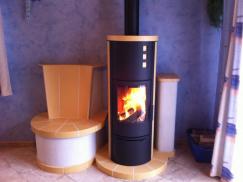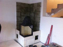 Lieferung eines Kaminofen MEZ Catania und errichtung eines Podestes und einer Sitzbank aus Keramik
